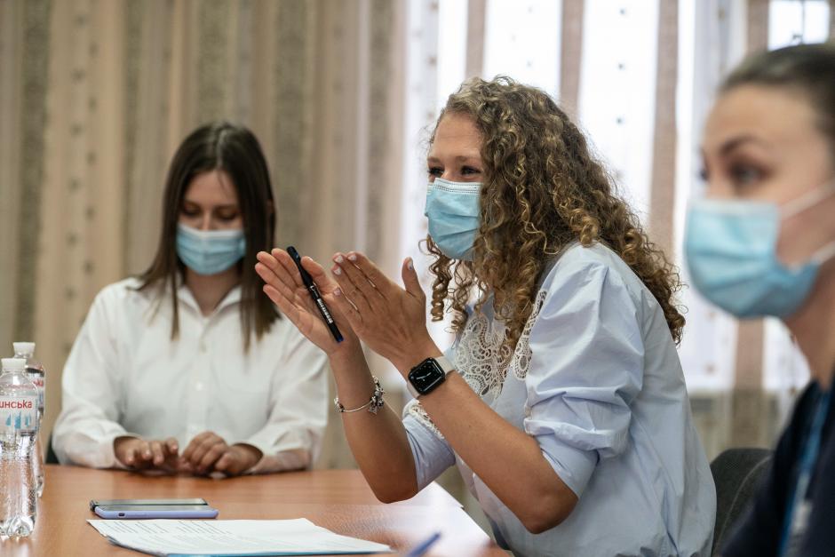Young participants in a meeting with OSCE Secretary General Helga Maria Schmid discussing youth efforts for social cohesion and development in eastern Ukraine, Kramatorsk, 28 May 2021