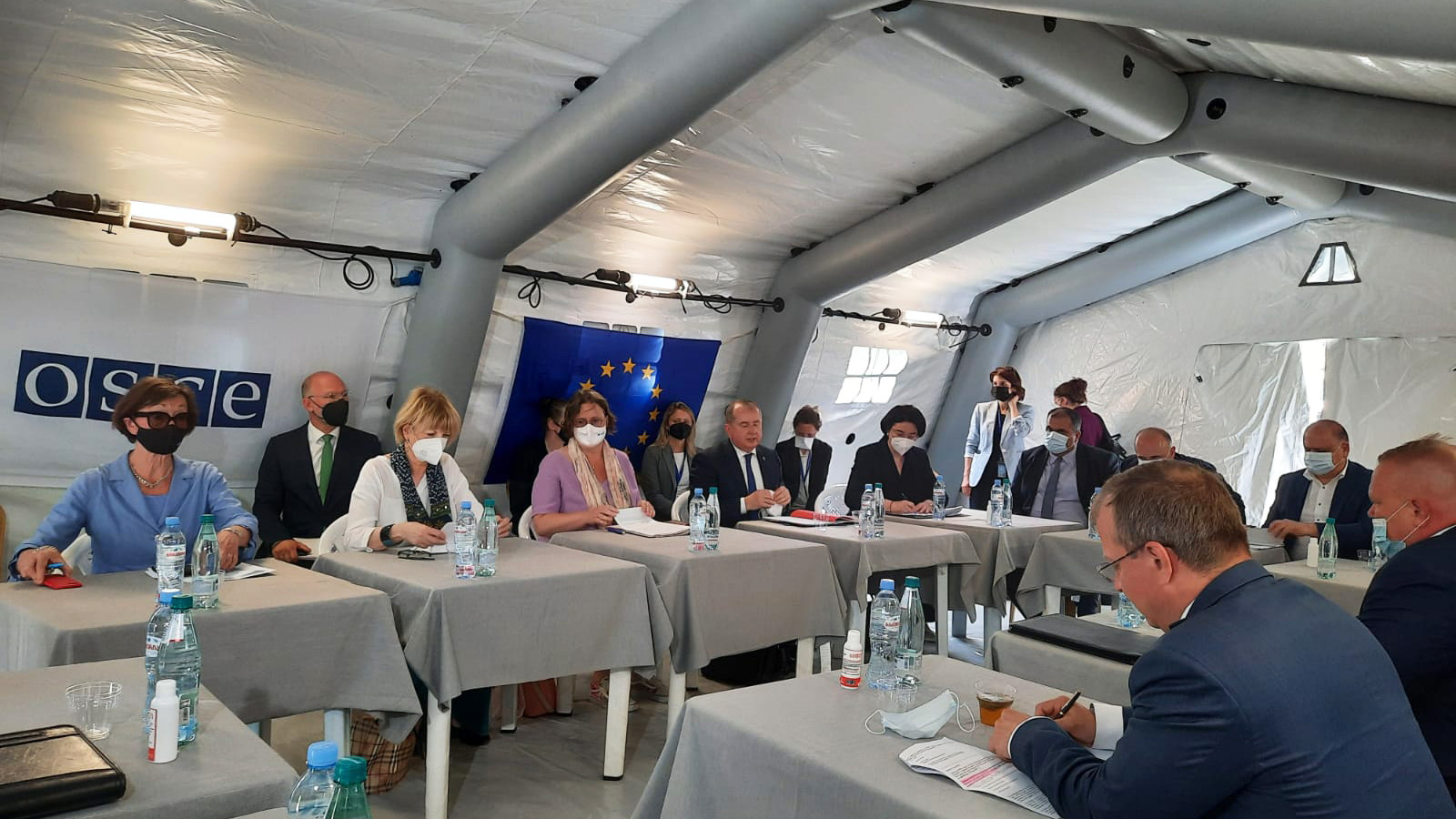 OSCE Secretary General Helga Maria Schmid (second from the left) addressing participants of the 100th meeting of the Incident Prevention and Response Mechanism, Ergneti, 15 June 2021.