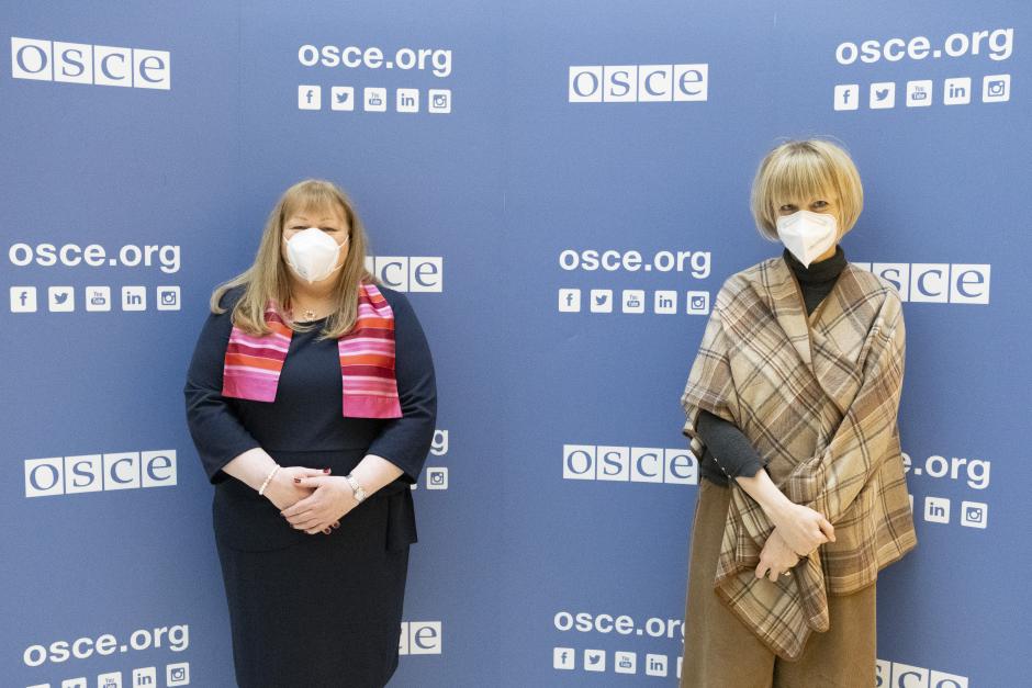 H.E. Anne-Marie Callan, Ambassador and Permanent Representative of Ireland to the OSCE, with OSCE Secretary General Helga Maria Schmid, Vienna, 18 January 2022.