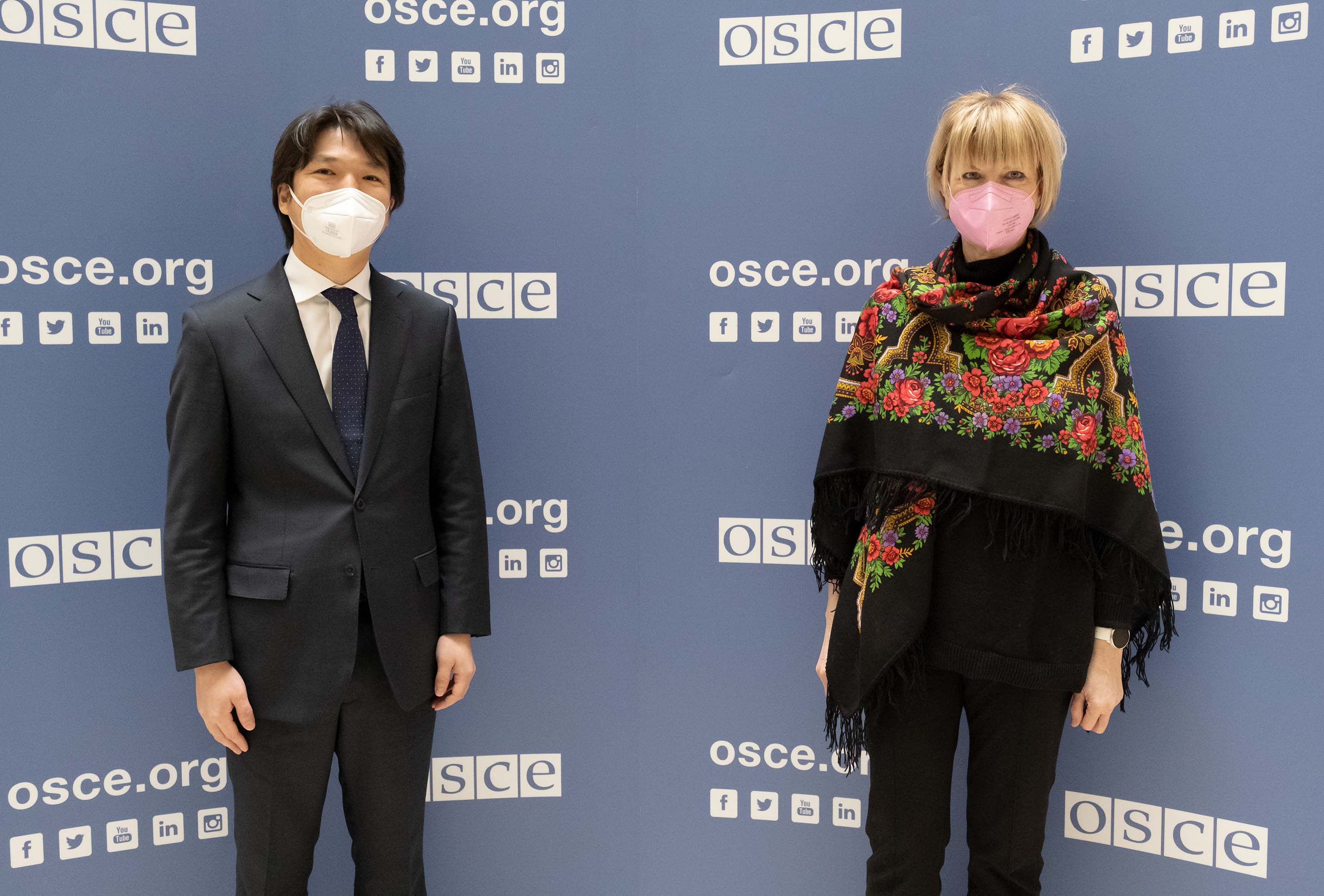 H.E. Mijiddorj Tsengeg, Ambassador and Permanent Representative of Mongolia to the OSCE, with the OSCE Secretary General Helga Maria Schmid, Vienna, 21 January 2022.