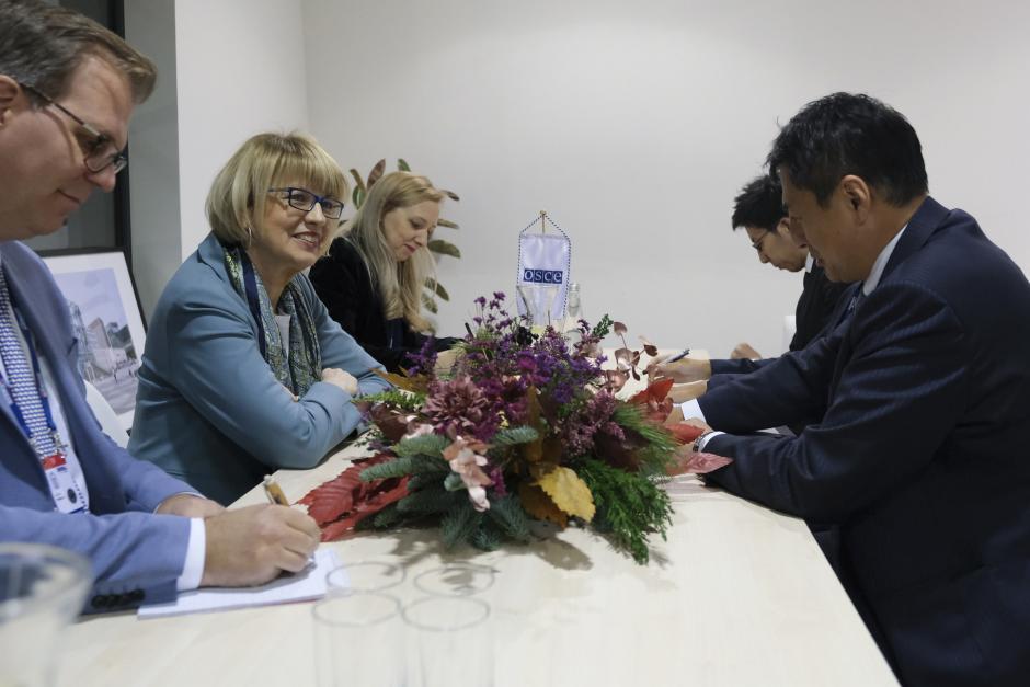 OSCE Secretary General Helga Maria Schmid meets with State Minister for Foreign Affairs of Japan Shunsuke Takei at the 29th OSCE Ministerial Council, Łódź, 2 December 2022.