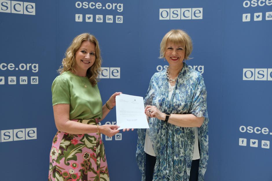 H.E. Helga Hauksdóttir, Ambassador and Permanent Representative of Iceland to the OSCE, with the OSCE Secretary General Helga Maria Schmid, Vienna, 18 August 2023.