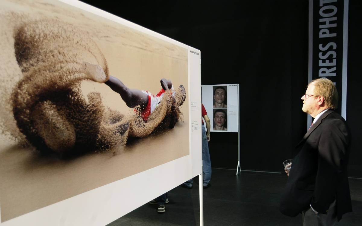 Ambassador Hans Ola Urstad, Head of OSCE Mission to Serbia, looks at one of the photos after the opening of the World Press Photo Exhibition in Belgrade, event set up with the Mission's support, 17 May 2009