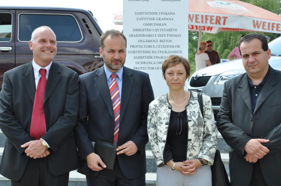 L-R: The OSCE Mission's Co-ordinator for South Serbia Jeroen de Vries, Protector of Citizens Sasa Jankovic, Czech Amb. to Serbia Hana Obruskova and Medvedja's Mayor Slobodan Draskovic at the handover of cars and IT equipment, Medvedja, 26 May 2009.