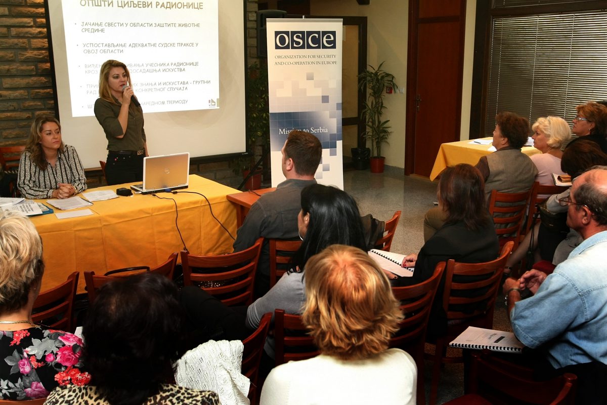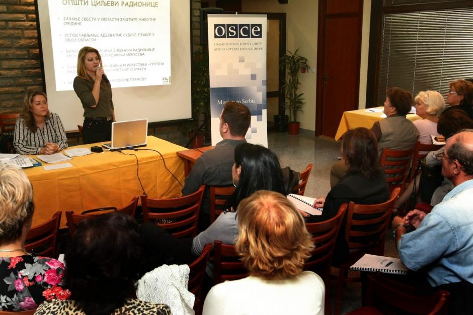 Mirjana Nikolic, Secretary General of the Association of Misdemeanor Judges of Serbia (left) listens as Jelena Kukolj, Ministry of the Environment and Spatial Planning (right) addresses the OSCE seminar on environmental law, Divcibare, 18 September 2009.