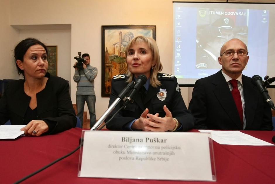 Biljana Puskar (c), Director of the Basic Police Training Centre, with Daiana Falloni (l) of the OSCE Mission to Serbia and Janos Kopas (r) of the Directorate for Police Education Professional Development and Science, Sremska Kamenica, 21 October 2009.