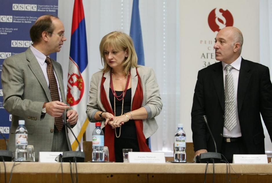 L-r: Thomas Moore, Acting Head of the OSCE Mission to Serbia, with Zorana Markovic, Director of the Serbian Anti-Corruption Agency and William Infante, UN Resident Co-ordinator and UNDP Representative, Belgrade, 9 December 2009.