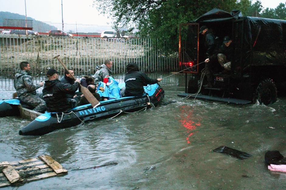 Members of the Serbian Gendarmerie rescue victims of the floods in Belgrade municipality of Rakovica, Belgrade, 18 May 2014.