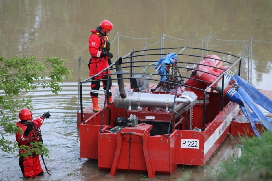 Rescue team drains water using water pumping equipment on Mlava river, Kostolac, 19 May 2014.