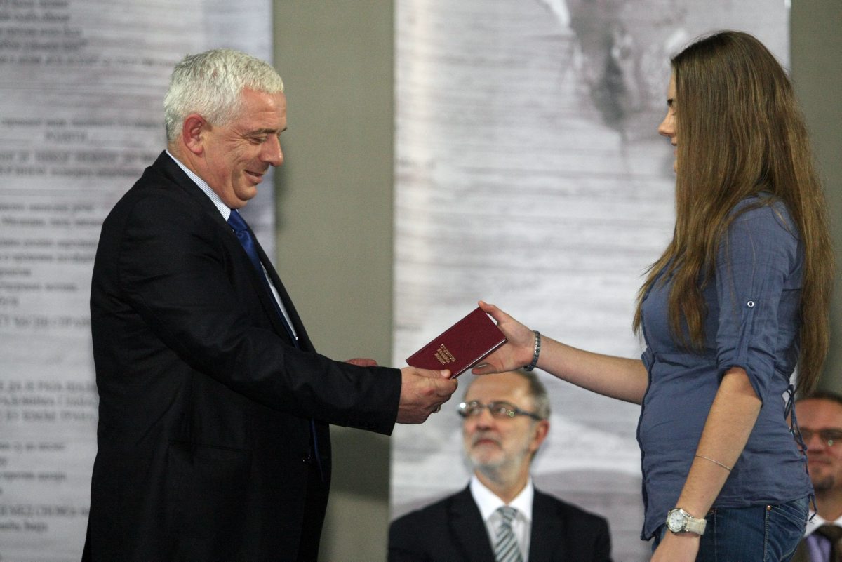 Nagip Arifi, Mayor of the Bujanovac municipality, hands over a student card to a freshman student from Bujanovac.