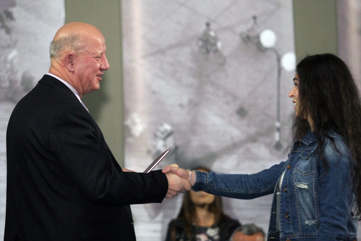 Zoran Stankovic, Head of the Government of Serbia Coordination Body for the municipalities of Presevo, Bujanovac and Medvedja hands over a student card to a freshmen student at the Bujanovac Branch of the Subotica Faculty of Economics