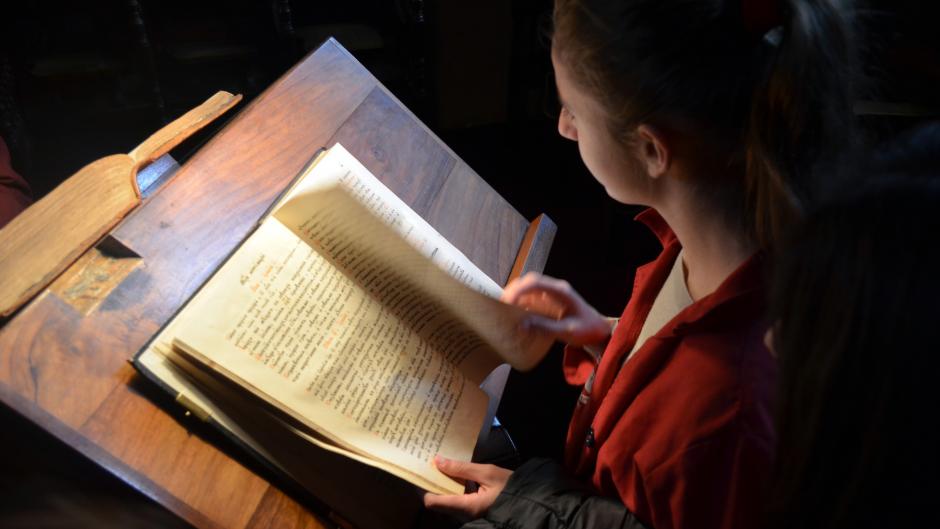 A student examines a prayer book during a trip to the Serbian Orthodox Monastery Visoki Dečani, 12 November 2014.