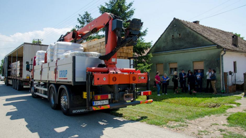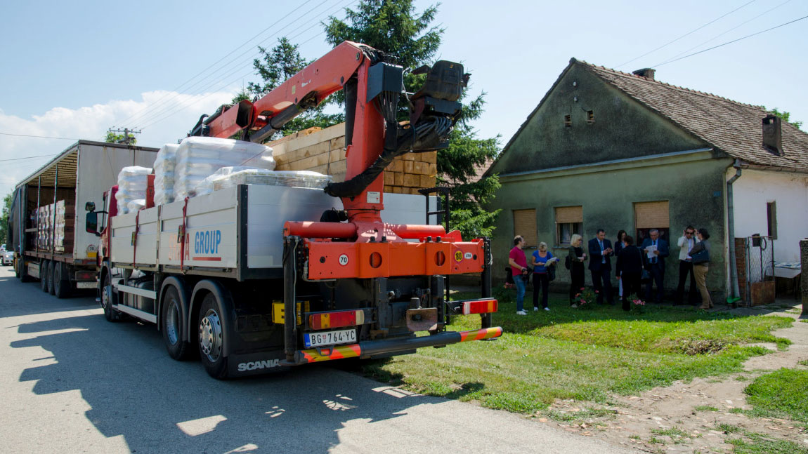 Loading trucks carry building material for 14 of the most vulnerable refugee families living in Serbia, Nikinci, 27 June 2015.