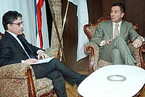 Ambassador Maurizio Massari, Head of OSCE Mission to Serbia and Montenegro (left), meeting the Montenegrin Prime Minister Milo Djukanovic in Podgorica on 21 January 2003.