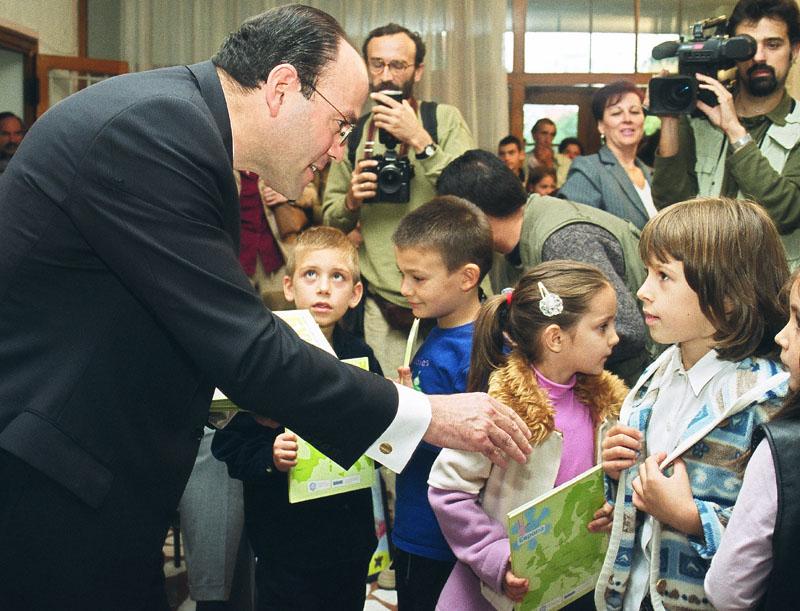 Acting Head of the OSCE Mission to FRY, Mark Davison, hands out alphabet books to school children in Belgrade, September 2002.