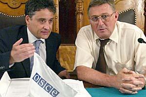 Ambassador Maurizio Massari meets Subotica Deputy Mayor, Bela Tonkovic, during a tour of Subotica and Novi Sad, part of the mission's outreach programme, 24 June 2003.