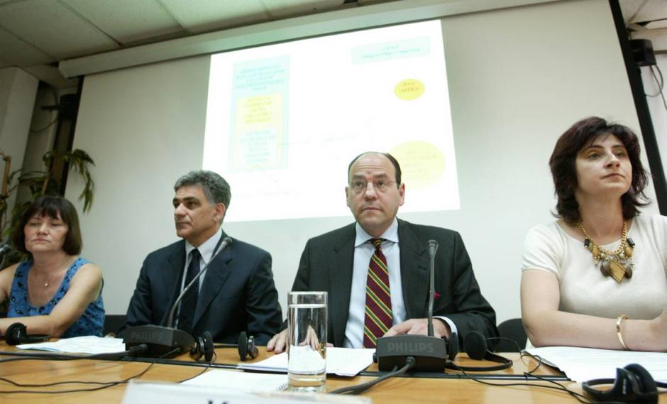 Mark Davison, Deputy Head of OSCE Mission in Serbia and Montenegro (right), and Dusan Zlokas from the Serbian Interior Ministry hold press conference to announce set-up of institution against human trafficking, Belgrade, 30 June 2004.