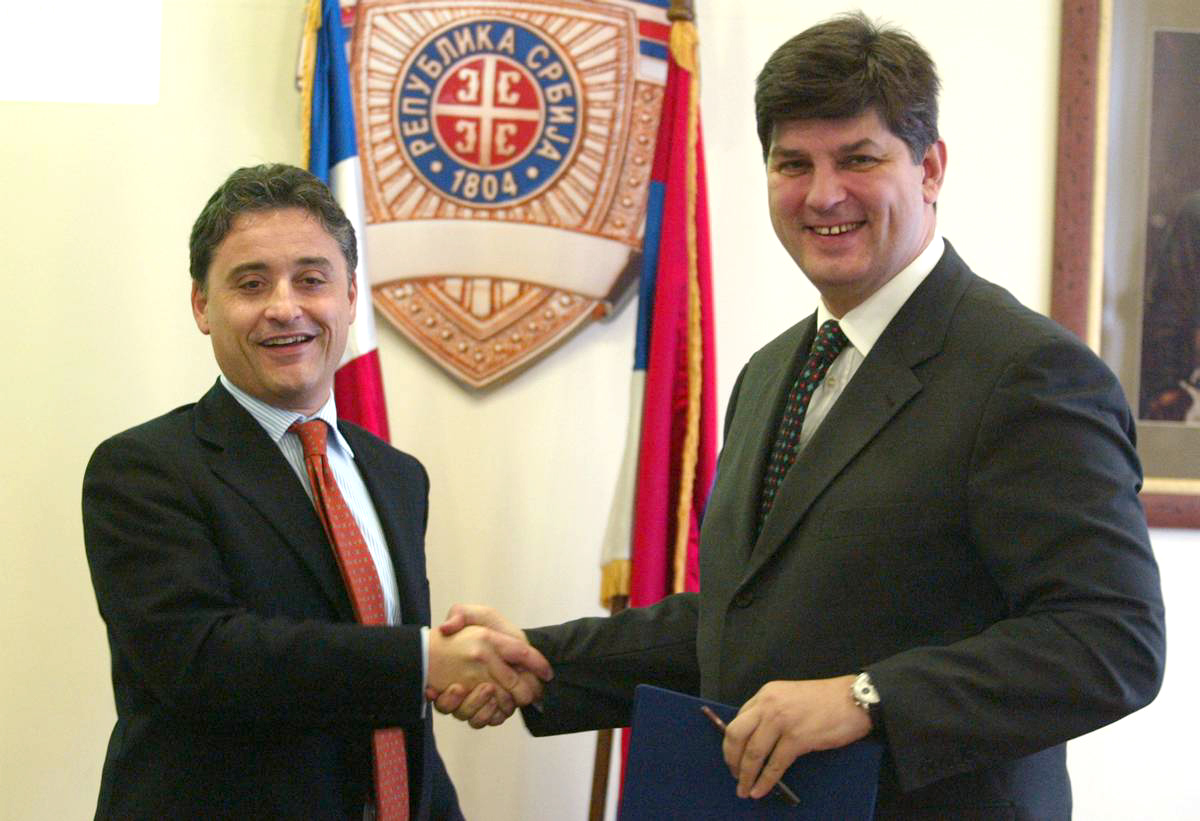 OSCE Mission Head Maurizio Massari (left) and Serbian Interior Minister Dragan Jocic signed an agreement on police reform in Belgrade, 17 November 2004.