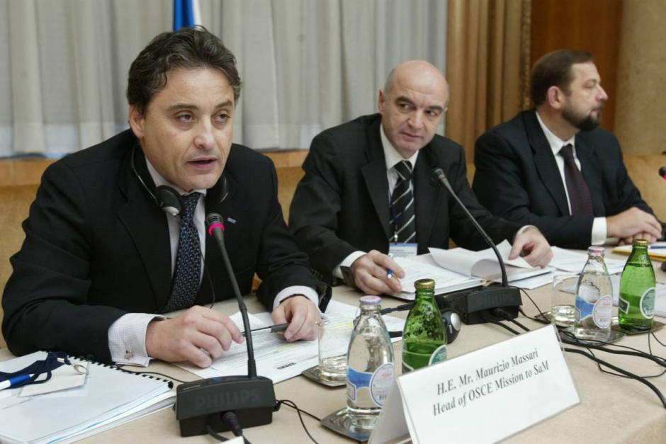 Head of OSCE Mission to Serbia and Montenegro, Maurizio Massari (left), and chairman Jovan Krstic at the fourth meeting of the South East Europe Prosecutor Advisory Group (SEEPAG) in Belgrade, 14 December 2004.
