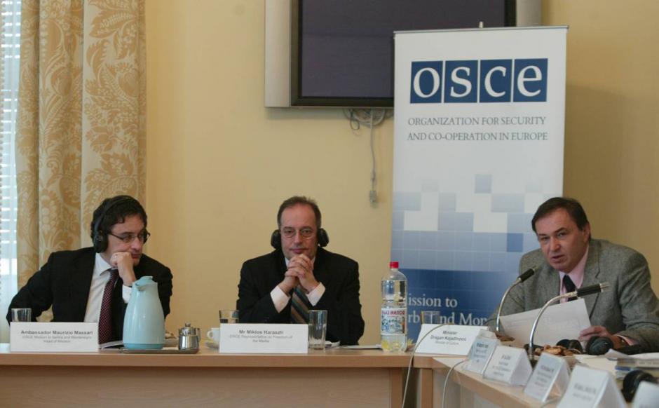 Head of Mission Maurizio Massari (left) and OSCE Representative on Freedom of the Media Miklos Haraszti at the roundtable Criminal Provisions on Insult and Libel, organized by the OSCE in Belgrade, 24 January 2005.