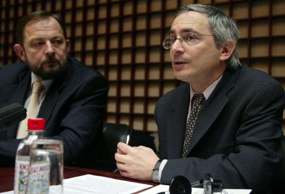 Branislav Bjelica, Serbian Deputy Justice Minister (left), with Douglas Wake, Deputy Head of the OSCE Mission to Serbia and Montenegro, at an expert discussion on asset seizure and the rule of law organized by the OSCE in Belgrade, 18 February 2005.