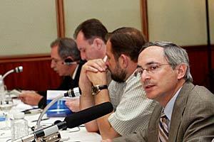 Deputy Head of the OSCE Mission to Serbia and Montenegro, Douglas Wake (right), during discussions on draft laws on war crimes in Serbia and Montenegro, Belgrade, 30 June 2005. The Mission supported the preparation of the draft.