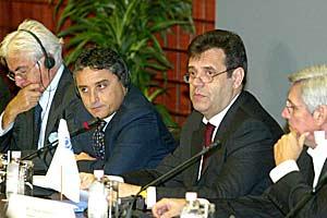 (L-R) Prof. Ugo Draetta Stability Pact Anti-Corruption Chairman, Head of Mission Maurizio Massari, Serbian Prime Minister Vojslav Kostunica and Minister of Justice Zoran Stojkovic at a conference on anti-corruption standards, Belgrade, 20 September 2005.