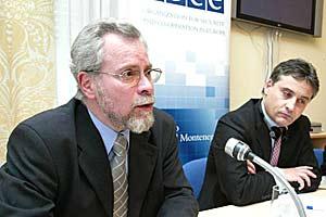 Ambassador Ivan Jestrab of the Czech Republic (left) and Maurizio Massari, Head of the OSCE Mission to Serbia and Montenegro announce the establishment of a new office within the Serbian Assembly to assess draft legislation for EU compatibility.