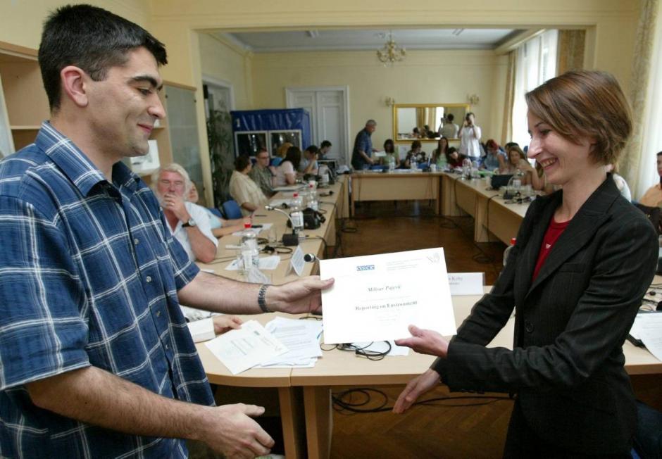Milisav Pajevic (left) receives a certificate on the completion of a journalism workshop organized by the OSCE Mission to encourage objective reporting on the state of the environment in the region, Sabac, Serbia, 29 July - 1 August 2006.