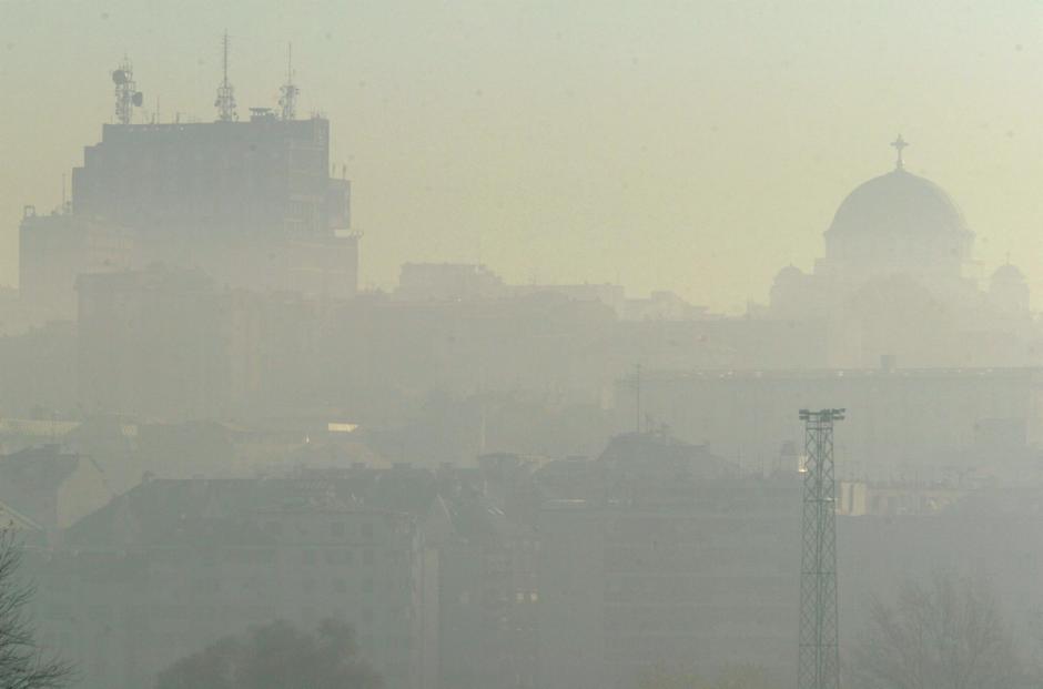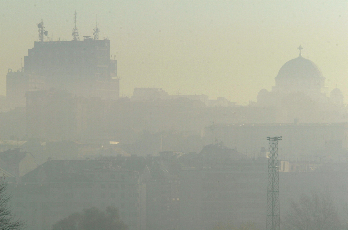 The Temple of Saint Sava, pictured on the right, one of Belgrade's landmarks, is barely visible in the distance because of the morning pollution.