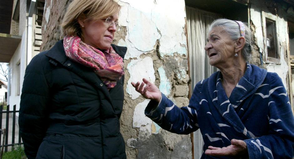 Head of the OSCE Mission's Democratization Department Hannelore Valier speaks with Rajic Cvijeta, a self-supporting Roma refugee from the settlement of Drenovac in western Serbia, 22 November 2006. (OSCE/Milan Obradovic)