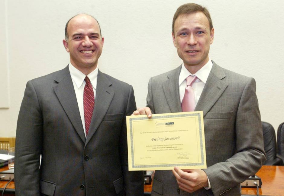 Anthony Pahigian (left), Deputy Head of the OSCE Mission to Serbia, with Predrag Jovanovic, Director of the Public Procurement Office of Serbia, at a seminar on public procurement, 15 March 2007.