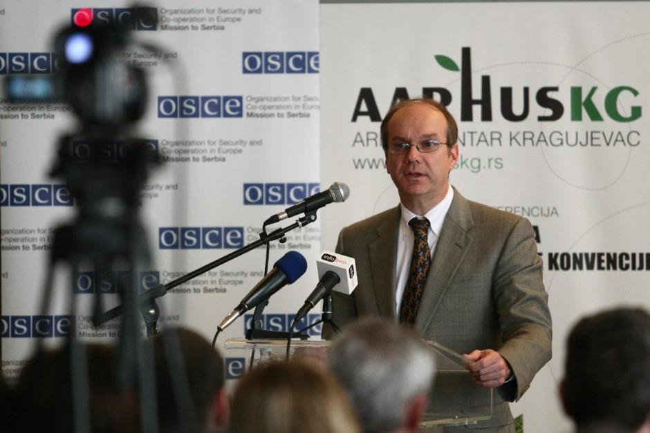 Thomas Moore, Deputy Head of the OSCE Mission to Serbia, speaks at a conference on the implementation of the Aarhus Convention in Serbia, Kragujevac, 28 April 2010.