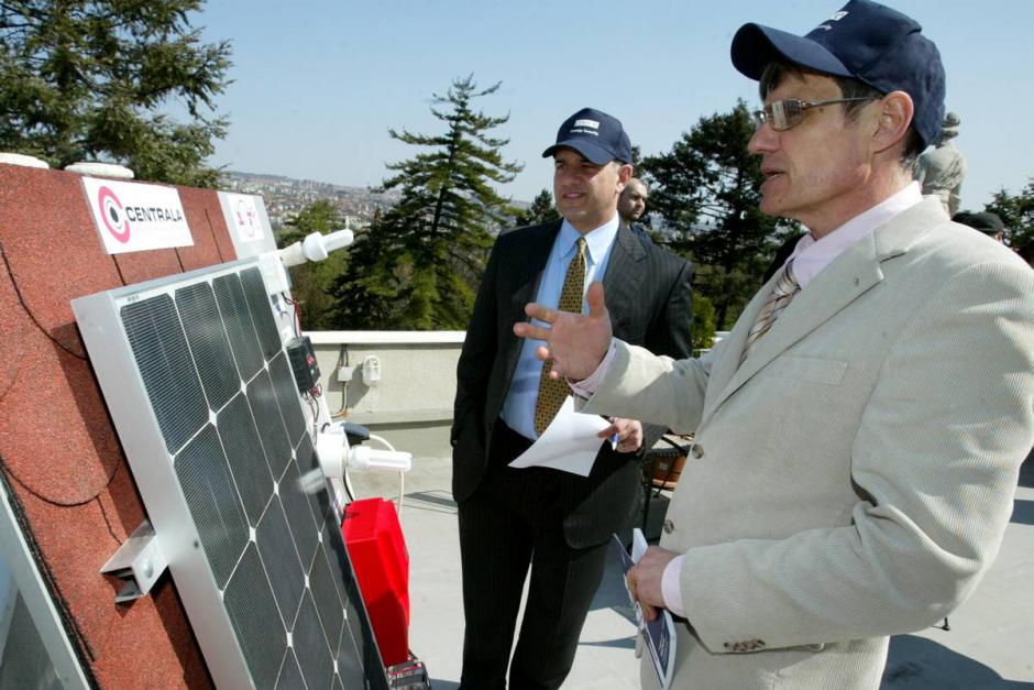 Anthony Pahigian, Deputy Head of the OSCE Mission to Serbia (left) and Dusan Vasiljevic, Head of the Mission's Economy and Environment Department, examine solar-powered sound equipment at a presentation on alternative energy, Belgrade, 4 April 2007.