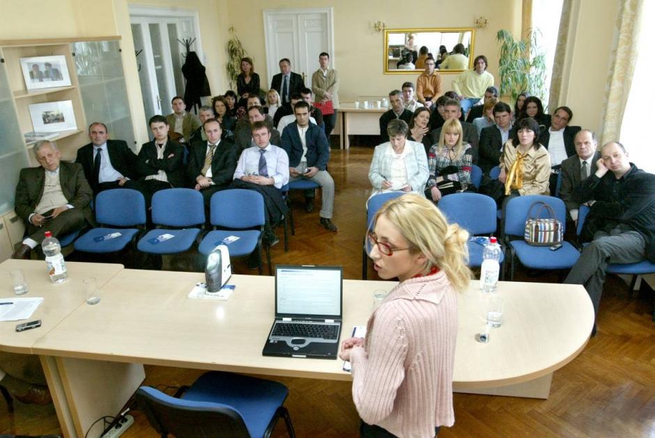 OSCE War Crimes Trials Analyst, Ana Petrovic, gives a presentation to a group of bar exam trainees from Southern Serbia, Belgrade, 3 April 2007.