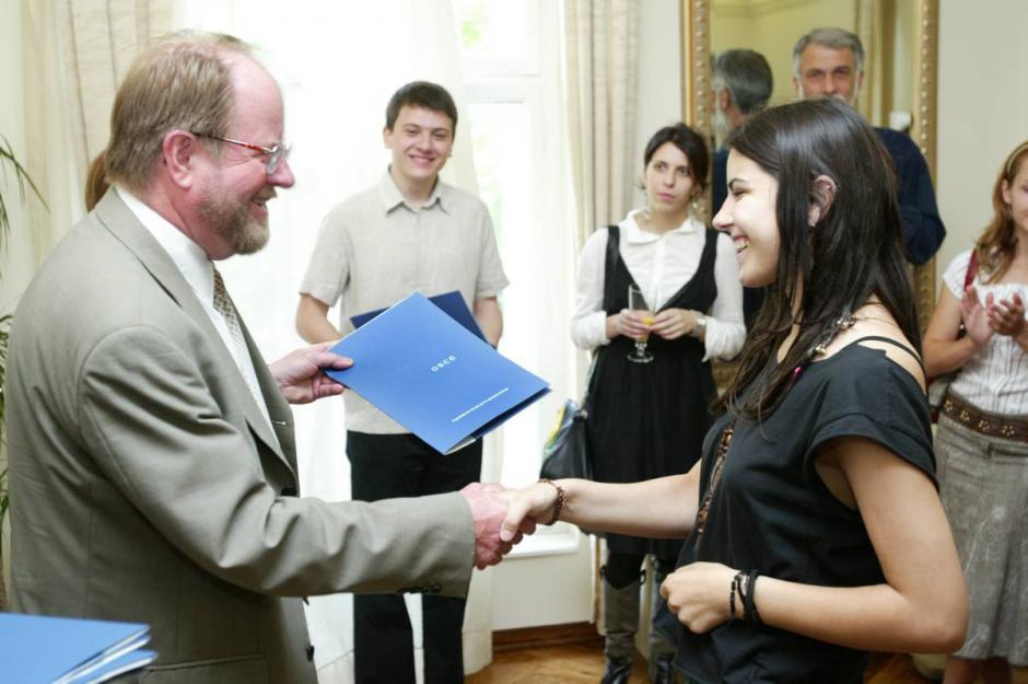 Ambassador Hans Ola Urstad, Head of OSCE Mission to Serbia presents an award to Katica Djurovic one of the top 10 graduates from the Belgrade University Political Science Faculty of Journalism, Belgrade, 21 May 2007.