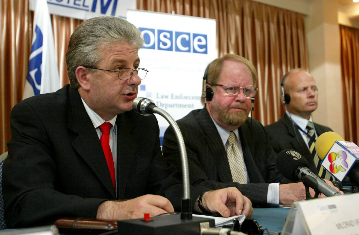 Milorad Veljovic (left), Director of Police for Serbia, and Ambassador Hans Ola Urstad, Head of the OSCE Mission to Serbia, at a Mission-supported conference on drug trafficking-related money laundering and asset seizure, Belgrade, 24 May 2007.
