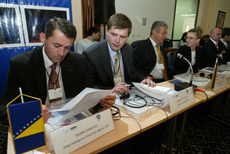 Participants exchange notes at an OSCE Mission to Serbia-organized conference on drug trafficking-related money laundering and asset seizure, Belgrade, 24 May 2007.