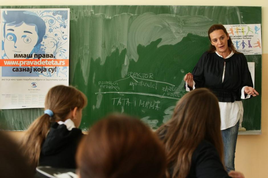 Gorica Colic, Counsellor from the Serbian Ombudsman, gives a lecture to schoolchildren in order to promote the institution's role in protecting the rights of children and youth, Trstenik, 22 September 2010.