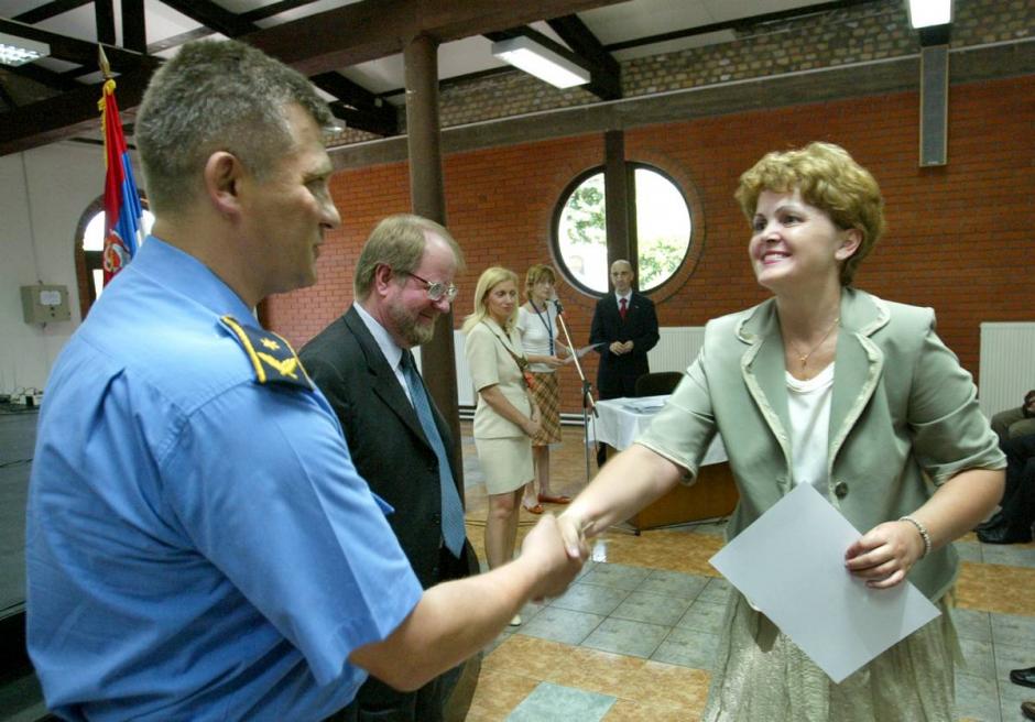 Mladen Kuribak (left), Head of Uniform Police Directorate, presents a certificate to a graduate of the Police Trainer Development Programme at the Zemun Police Academy, Belgrade, 22 June 2007. OSCE Mission Head Hans Ola Urstad is to his left.