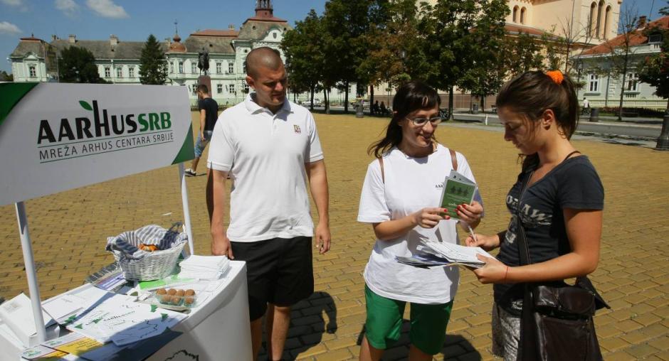 Young Aarhus Centre network volounteers explaining to citizens of Zrenjanin the importance of implementing the Aarhus Convention in Serbia, during an OSCE-supported awareness-raising campaing on citizens' participation in planning and the decision-making process in environmental matters at the local level. Zrenjanin, 3 August 2013. (OSCE/Milan Obradovic)