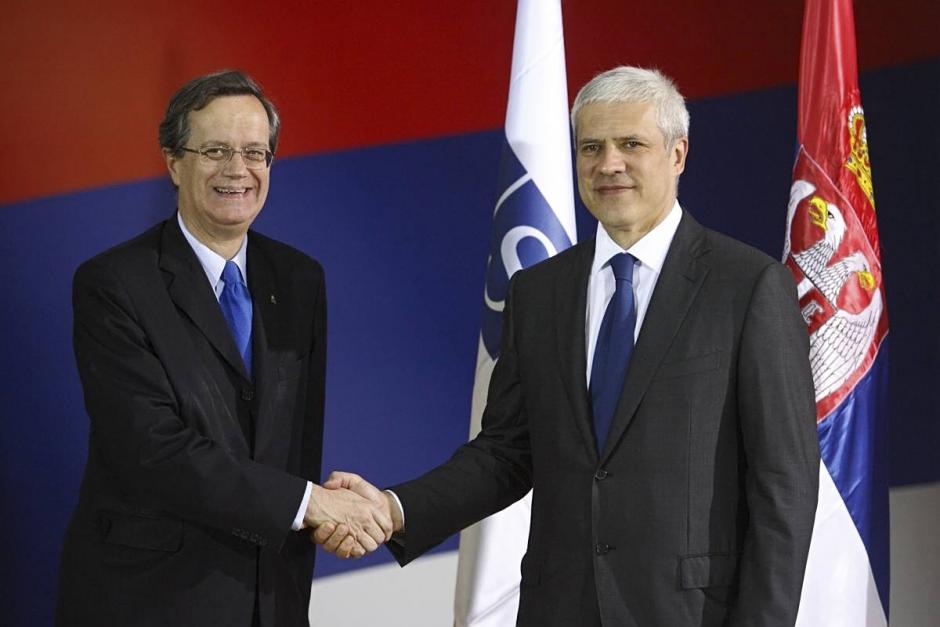 OSCE Secretary General Marc Perrin de Brichambaut (l) shakes hand with Serbia's President Boris Tadic at an event in Belgrade to mark the tenth anniversary of the OSCE Mission to Serbia, 16 May 2011.