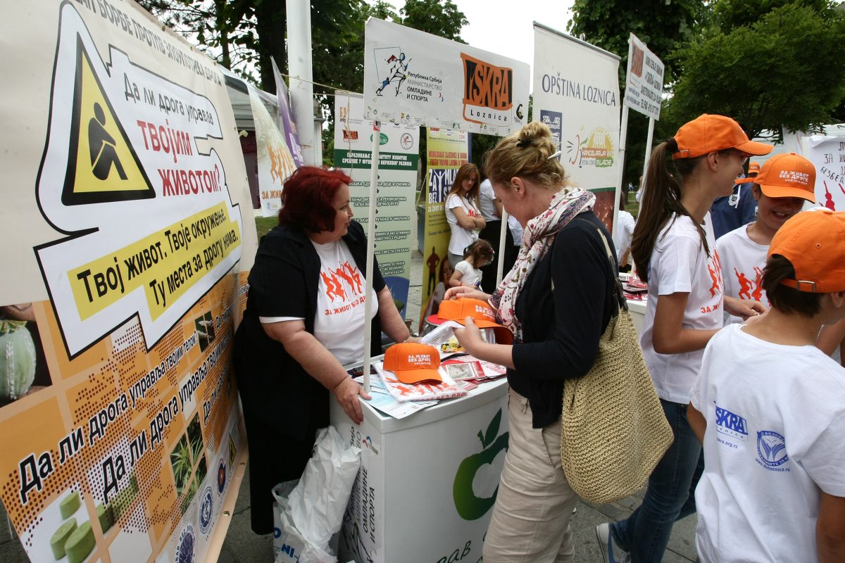 Local volunteers distribute information on the dangers of drug abuse, during a campaign held on International Anti-Drug Day, organized by local people through the Municipal Safety Council of Valjevo, supported by the OSCE Mission to Serbia, Valjevo, 26 June 2011.