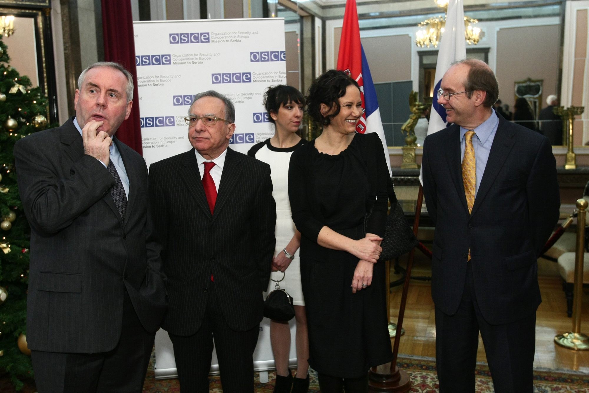 L-r: OSCE Mission to Serbia representatives: Frank York, Chief Fund Administration; Ambassador Dimitrios Kypreos, Head of Mission; Daiana Falloni, Head of the Democratization Department; Tom Moore, Deputy Head of Mission; and Maja Grsic, Assistant Translator (back), welcome guests to the OSCE Mission to Serbia Annual Reception at Belgrade City Hall, 14 December 2011.
