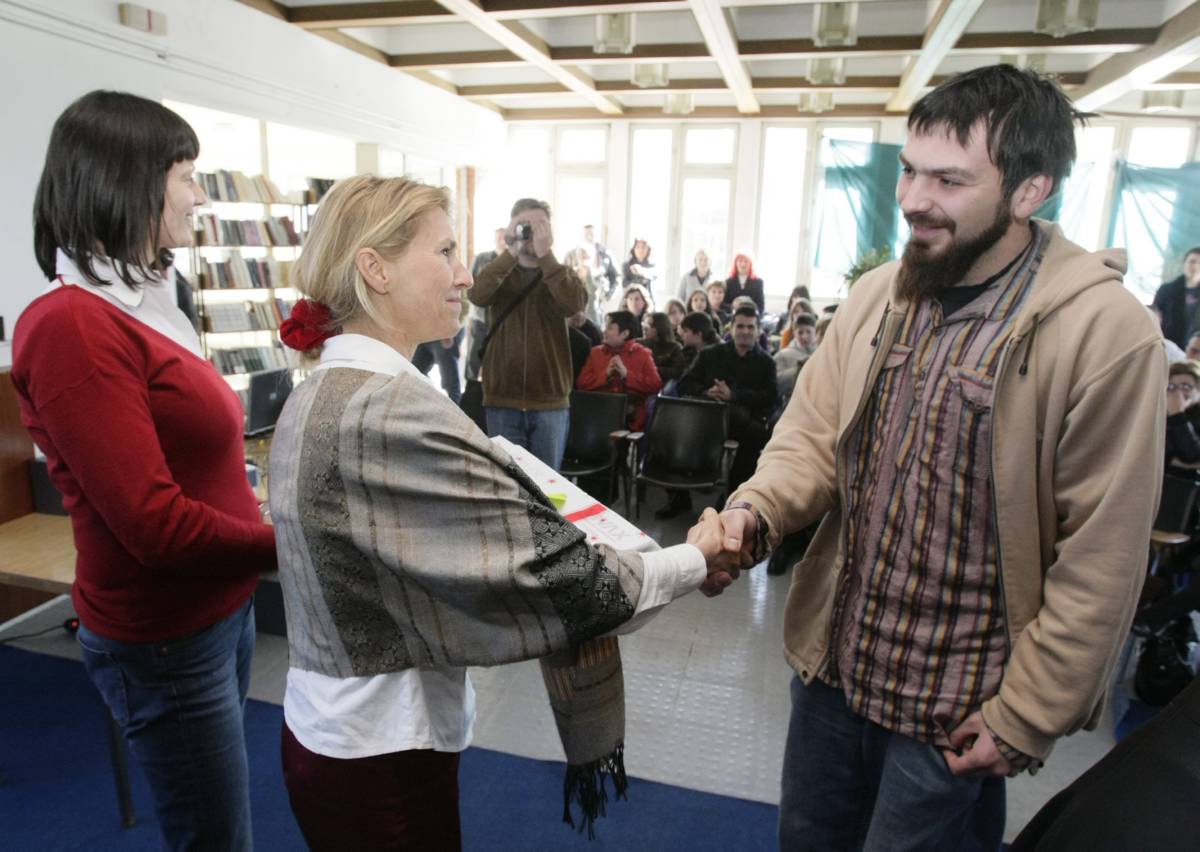 Zarko Velickovic (right) receives his prize for best cartoon from the Head of the Mission to Serbia's Rule of Law Department, Ruth Van Rhijn, at the awards ceremony for an anti-corruption art competition, Lebane, 26 March 2008.