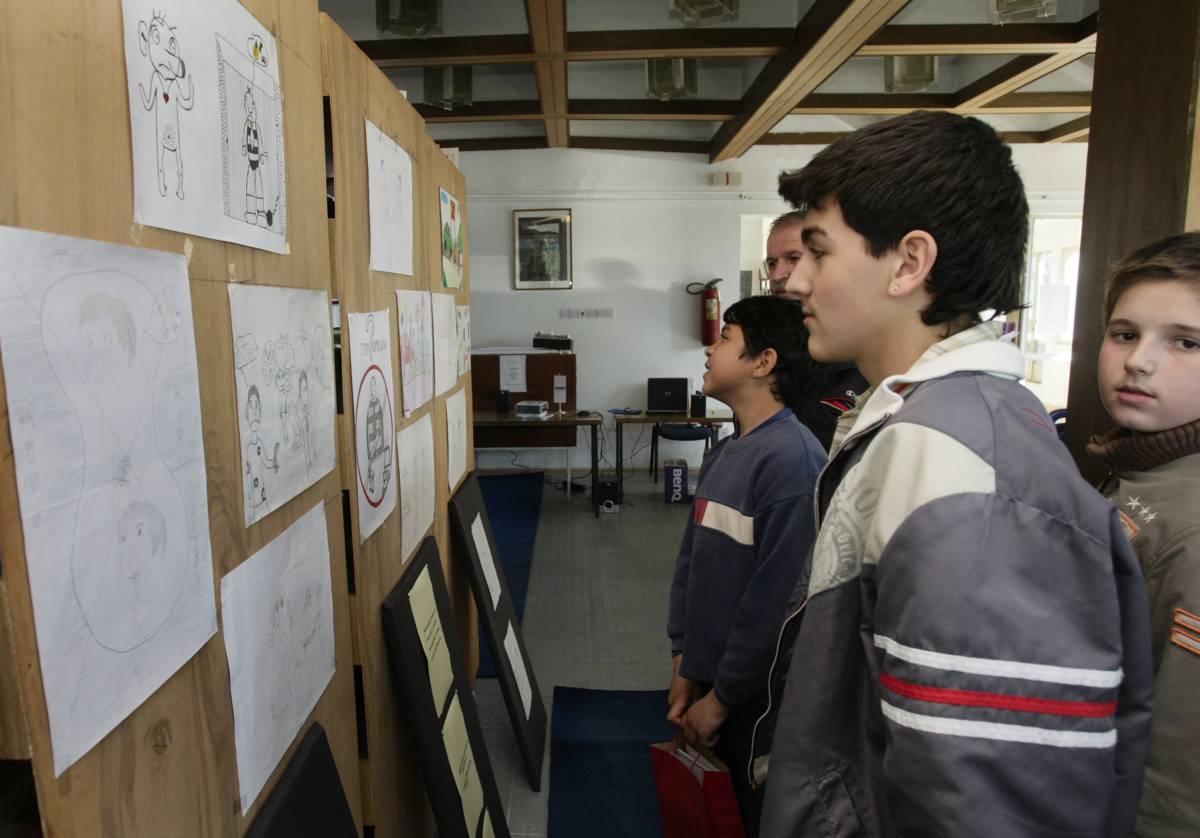 Pupils from the elementary school in the village of Bosnjace view some of the best entries in a Mission to Serbia-supported anti-corruption art competition, Lebane, 26 March 2008.