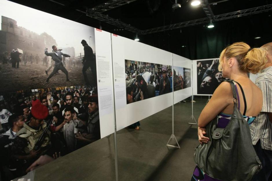 An exhibition visitor looks at one of Eduardo Castaldo’s Dawn of Revolution shots taken during the Egyptian demonstrations against former president Hosi Mubarak, which won the third prize for Spot News stories, Belgrade, 20 July 2012.