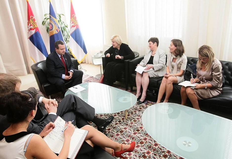 Serbian Prime Minister and Interior Minister, Ivica Dacic (centre), meets with an OSCE delegation headed by the Representative on Freedom of the Media, Dunja Mijatovic (right), Belgrade, 19 September 2012.