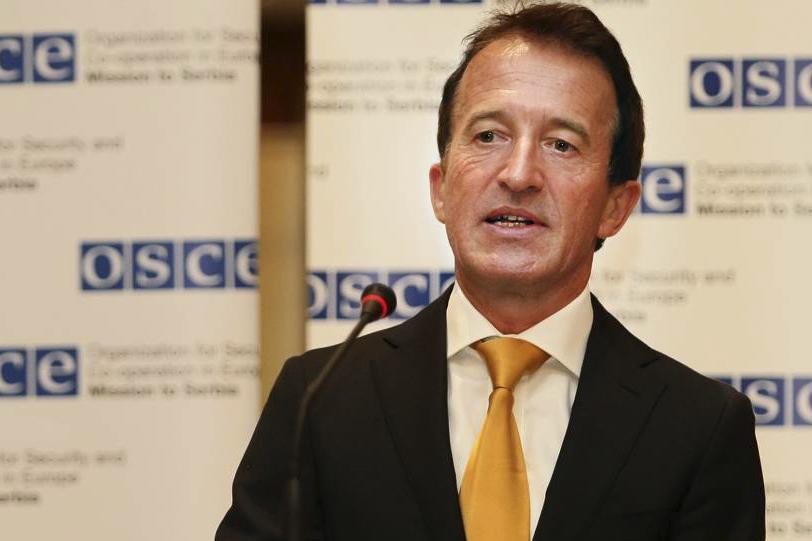 The Head of the OSCE Mission to Serbia, Ambassador Peter Burkhard, delivers a welcoming address at the award reception.