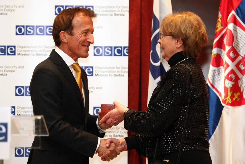 As an exception to its usual practice, the Mission decided this year to posthumously recognize Professor Vojin Dimitrijević of the Belgrade Centre for Human Rights for his life-long dedication to the promotion of human rights and for his contribution to the establishment of the OSCE Mission’s mandate. Branka Dimitrijević, Professor Dimitrijević’s widow, accepted the award on his behalf.